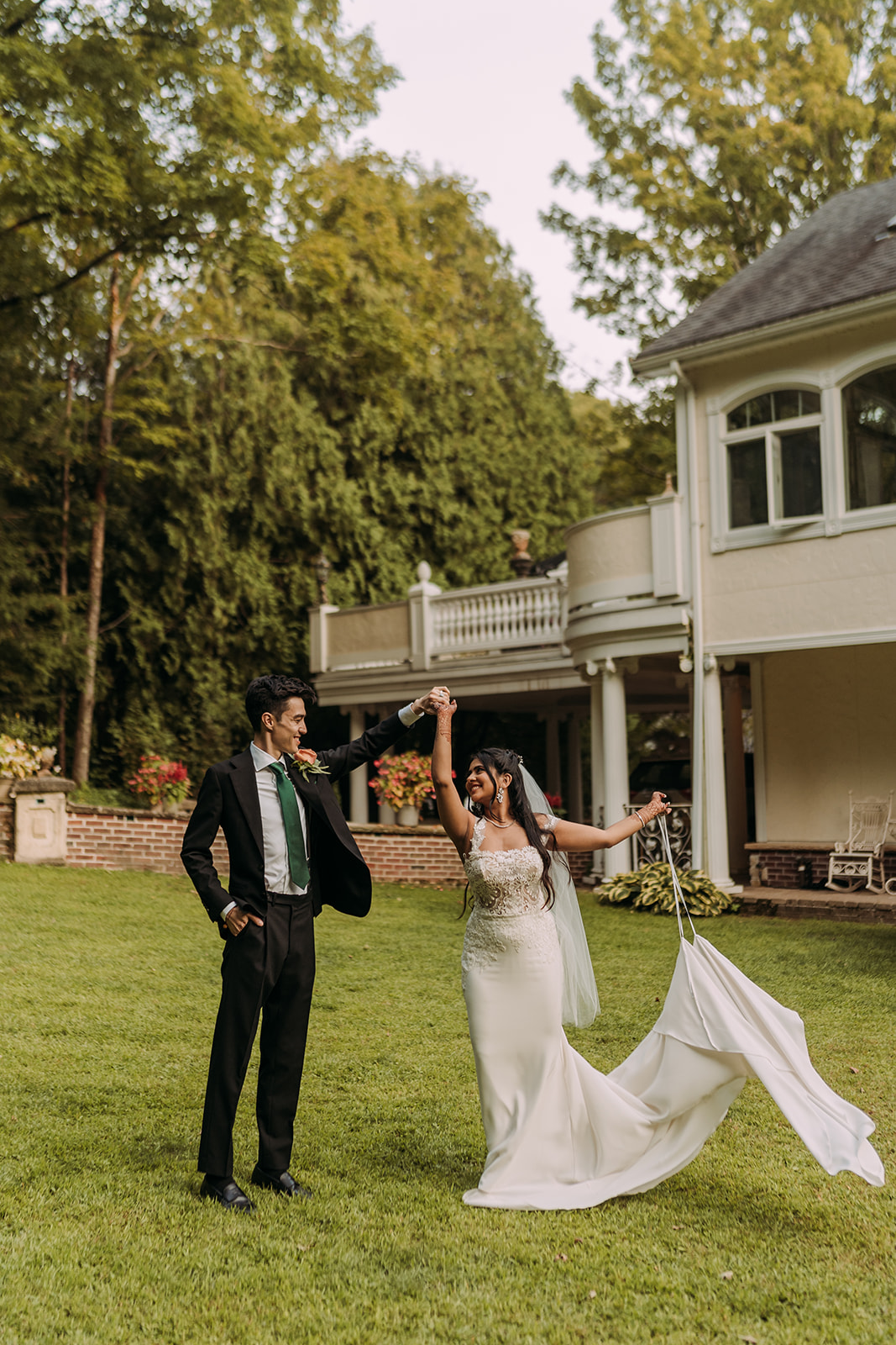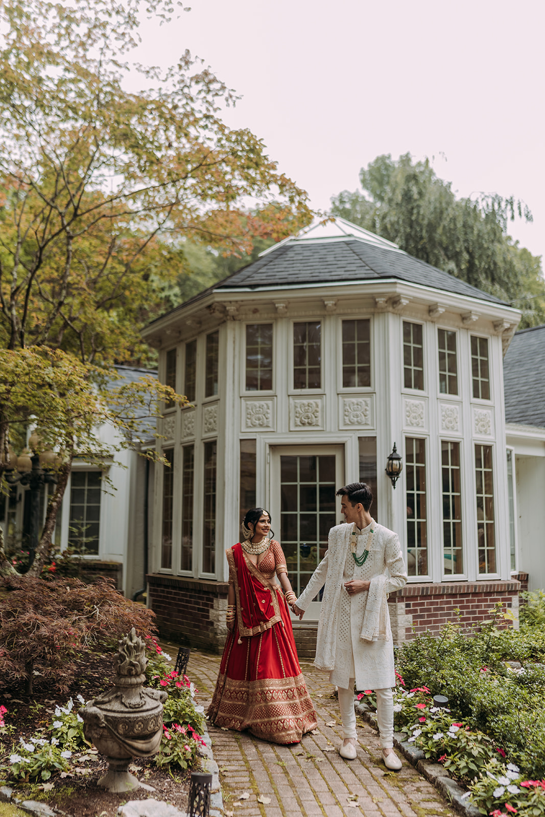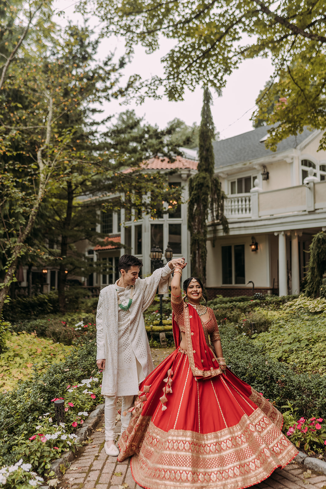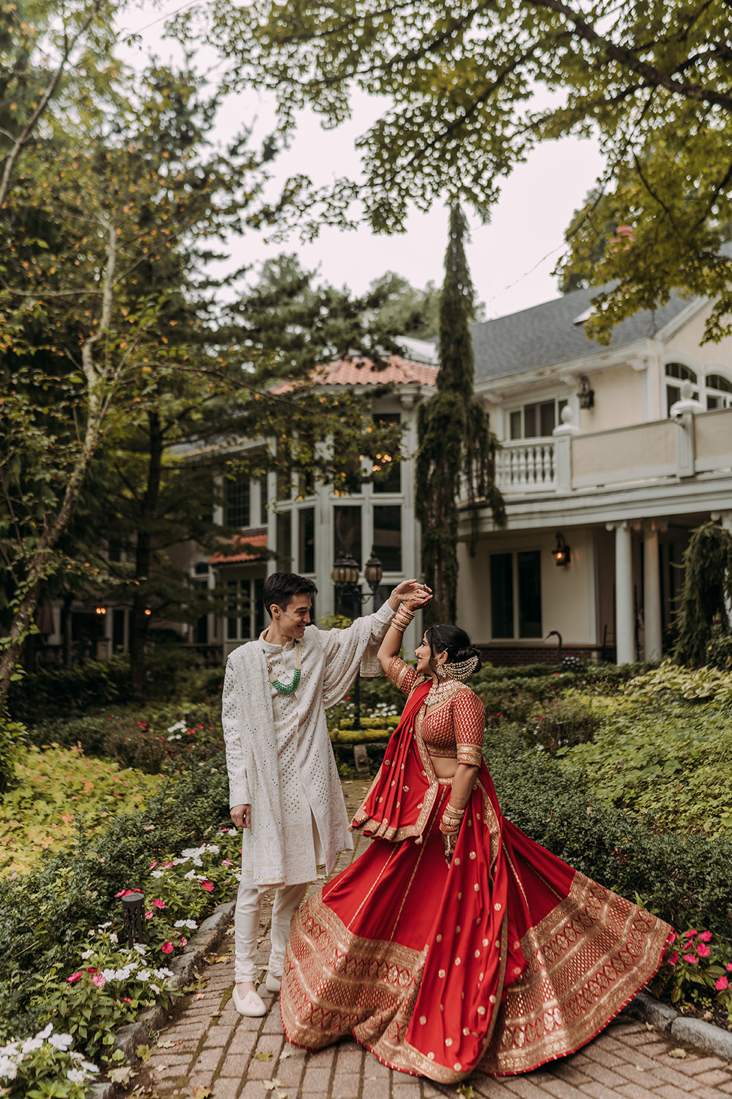 After the morning ceremony concluded, the schedule allowed for a break in the middle of the day. This pause created space for everyone to reset before transitioning into the next chapter of the celebration. Aastha changed into Western attire, marking a shift in both style and tone. Her gown from Pronovias brought a timeless elegance to the afternoon, while David’s suit from SuitSupply complemented the refined aesthetic beautifully. The wardrobe change symbolized the blending of their cultures in a visual way, honoring the morning’s traditions while embracing a classic Western ceremony to follow. The mansion setting provided a stunning backdrop throughout the day, seamlessly accommodating both celebrations within one cohesive experience.