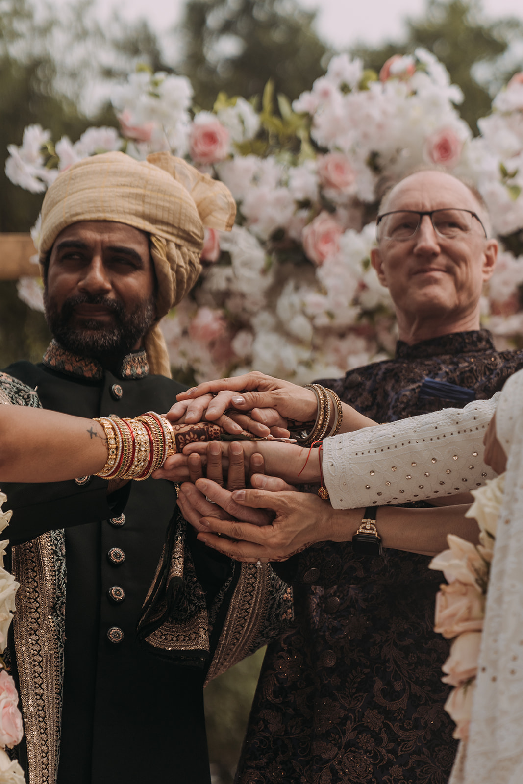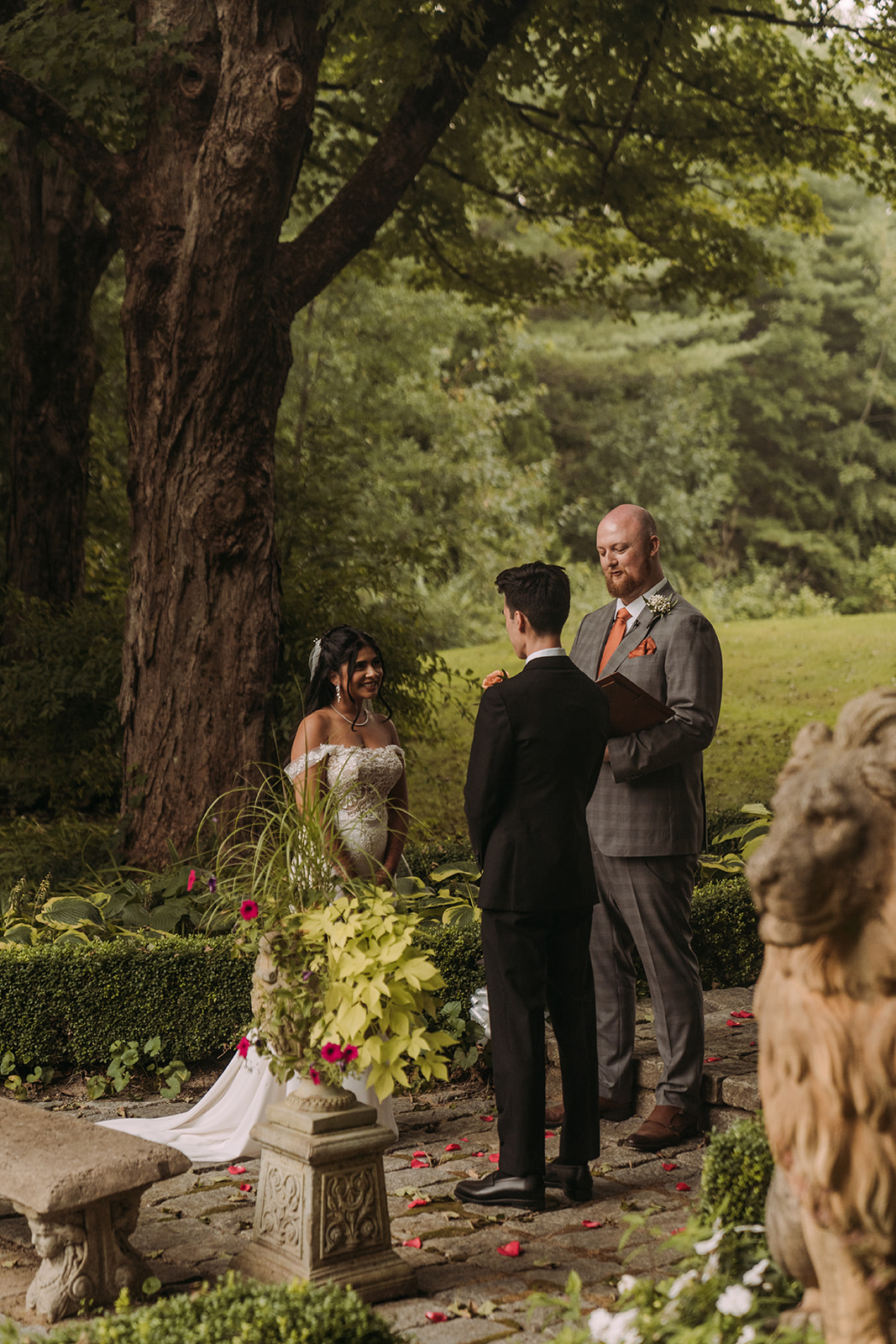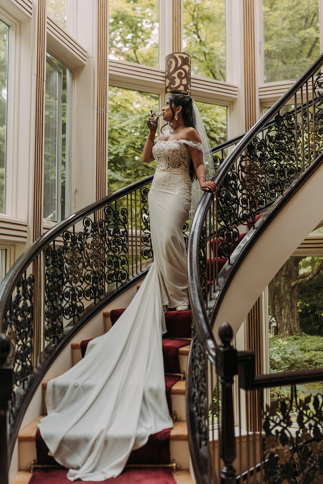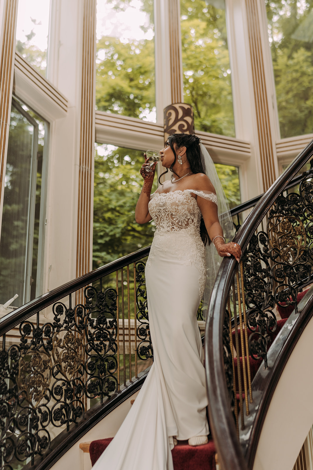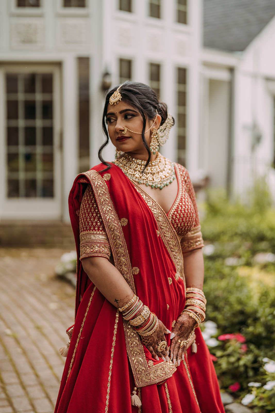 After the morning ceremony concluded, the schedule allowed for a break in the middle of the day. This pause created space for everyone to reset before transitioning into the next chapter of the celebration. Aastha changed into Western attire, marking a shift in both style and tone. Her gown from Pronovias brought a timeless elegance to the afternoon, while David’s suit from SuitSupply complemented the refined aesthetic beautifully. The wardrobe change symbolized the blending of their cultures in a visual way, honoring the morning’s traditions while embracing a classic Western ceremony to follow. The mansion setting provided a stunning backdrop throughout the day, seamlessly accommodating both celebrations within one cohesive experience.