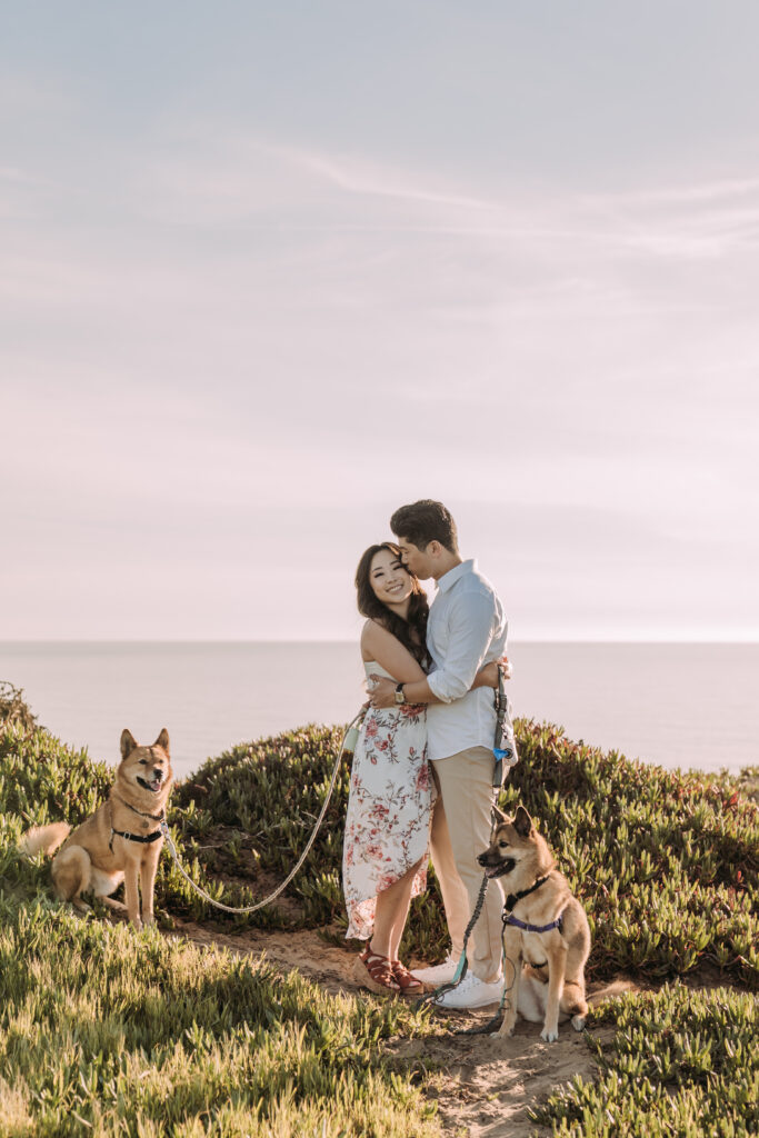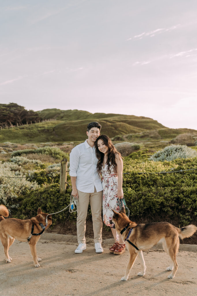 Fort Funston is not only beautiful for couples, it’s also known for being dog-friendly. If you have a pet, you can easily include them in part of your session, whether for a few candid shots or just to enjoy the walk together. Dogs love the open space and trails, and having them there can add energy and authentic interaction to your photos. Even a few moments with your pet running, exploring, or snuggling with you can create memorable, joyful images. Including your furry family member is completely optional, but it’s a great way to make the session feel personal and capture a little extra personality in your photos.