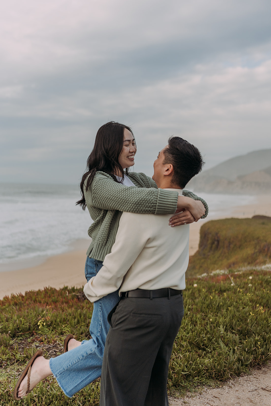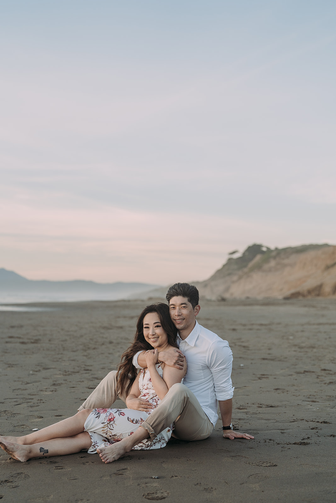 For couples who want something a little more dramatic, head to Battery Spencer. This viewpoint gives you one of the most jaw-dropping angles of the Golden Gate Bridge, high above the water with the city in the distance. It feels wild, open, and powerful, all while still being incredibly romantic. This spot works best for couples who are okay with wind, fog, and a bit of adventure energy. The photos here tend to feel more epic than intimate, so it’s perfect for engagement sessions or “we just got engaged!” shoots. Wide shots work beautifully here, especially when the couple is framed small against the bridge and landscape. It’s less about posing and more about presence.